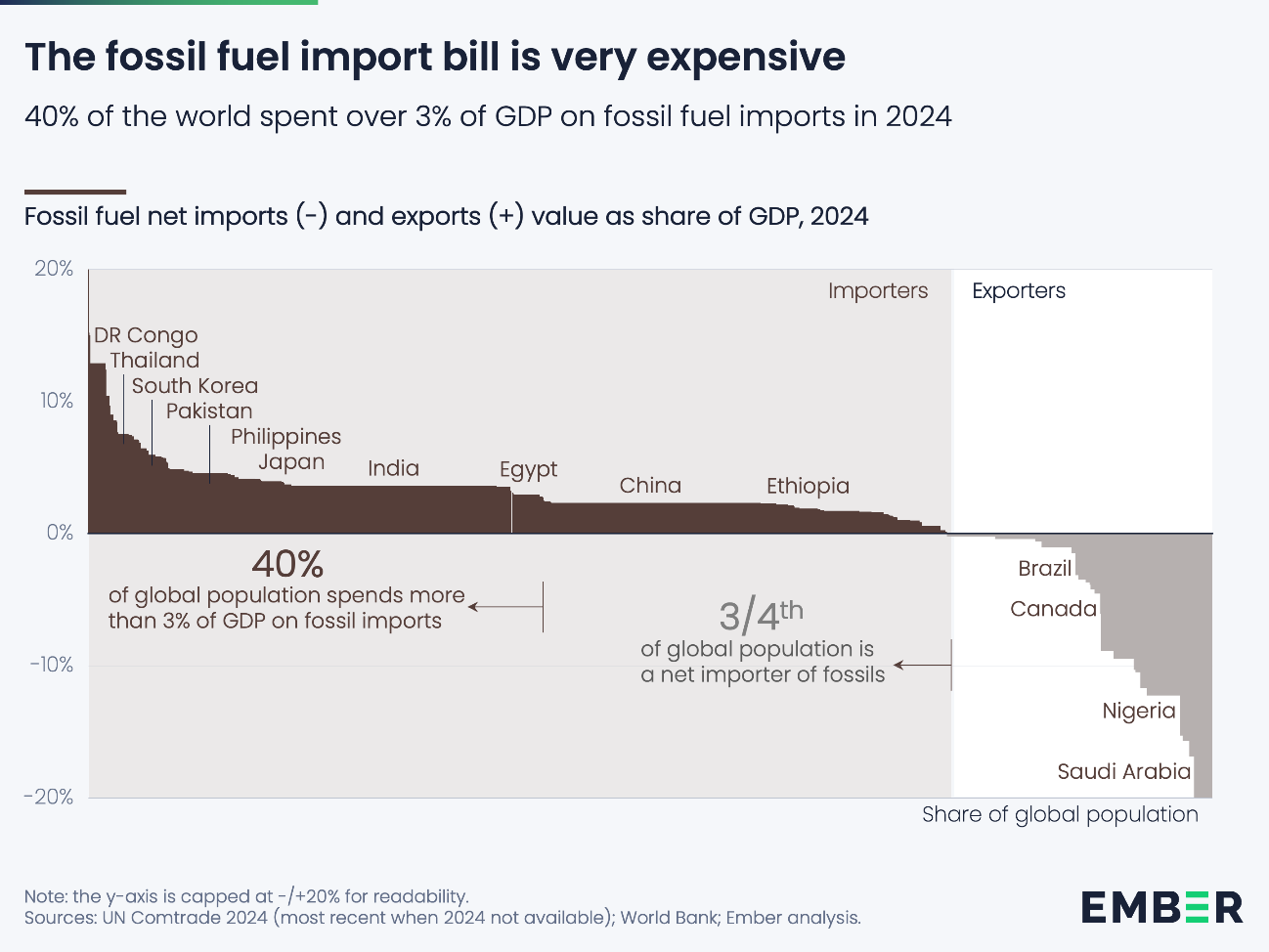 エンバーの分析によると、世界人口の4分の3は化石燃料の純輸入国に住んでいます。50カ国が一次エネルギーの半分以上を化石燃料で輸入しています。例えば、スペイン、イタリア、ドイツはエネルギーの3分の2以上を輸入しています。日本と韓国は80%以上、インドは37%、中国は4分の1を輸入しています。貿易ルートが脅かされると、これらの国々は大きな影響を受けます。