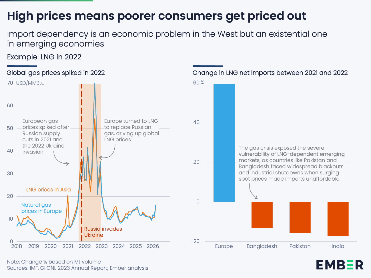2022年の危機はまさにこのことを如実に示しました。欧州はロシア産ガスの代替供給源確保に奔走し、液化天然ガス(LNG)の純輸入量が60%近く増加しました。一方、バングラデシュ、パキスタン、インドはLNG輸入量が13~17%減少しました。これは自主的な削減ではなく、価格競争で負けた結果です。
