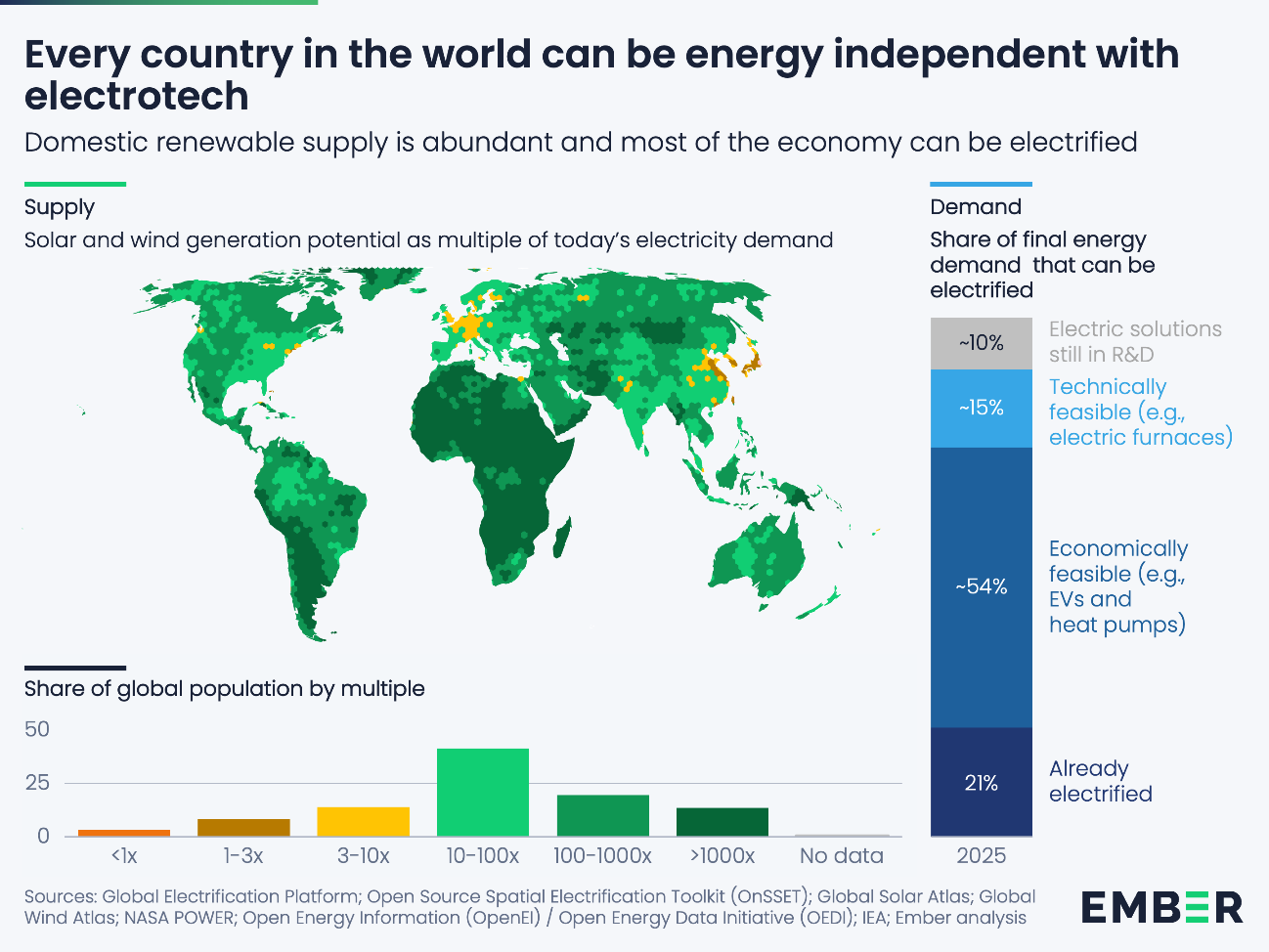 化石燃料輸入への依存度を大幅に削減する技術は既に存在しています。実証済みの技術を用いれば、世界経済の4分の3以上を電化できます。そして、世界中のどの国にも、その需要を自国産のエネルギーで賄うのに十分な風力と太陽光の潜在力があります。